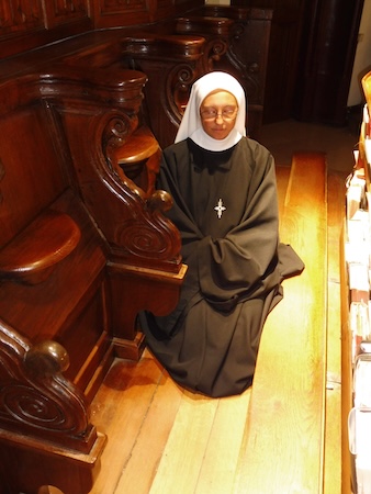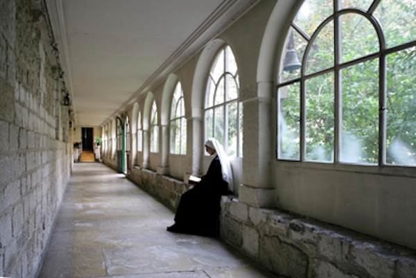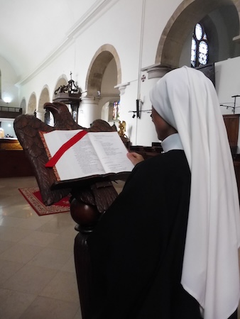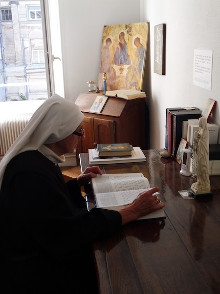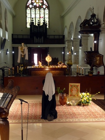 Mère Catherine Mectilde du Saint Sacrement de Bar, fondatrice des Bénédictines de l’Adoration Perpétuelle du Saint Sacrement en 1653 à Paris, est venue elle-même établir ce nouveau monastère de son Institut en 1677. Elle avait acheté l’Hôtel de Mathan, construit à l’emplacement de l’ancien château de Philippe Auguste, là où une autre lorraine, Jeanne d’Arc, avait souffert un peu plus de deux cents ans auparavant. C’est la Révolution qui en a chassé les moniales ; elles poursuivirent cependant clandestinement leur vie monastique et leur œuvre adoratrice avant de se regrouper, en 1802, dans l’ancien couvent des Minimes, eux-mêmes victimes des mêmes violences. Héritier à la fois de la spiritualité bénédictine et du charisme eucharistique de Mère Mectilde, le Monastère de l’Immaculée Conception de Rouen avance solidement campé sur ses deux pieds, riche aussi du trésor de prière engrangé par les frères Minimes qui nous ont précédées en ces lieux. L’essentiel des activités qui constituent notre « labora » est un modeste atelier de biscuiterie dont les produits se passent aisément de publicité. L’adoration garde une place essentielle, au long des journées que ponctuent les offices (Louange du matin 7h15, Eucharistie avec Tierce intégré 9h30, Sexte 12h30, None 14h30, Vêpres 18h). Notre spiritualité monastique est fortement nourrie de vie eucharistique et mariale puisque la Vierge Marie est l’abbesse de chacun des monastères de l’Institut. Deux cents ans avant Thérèse de l’Enfant Jésus, notre fondatrice proposait à qui le souhaitait sa « petite voie » d’humilité confiante ; son insistance sur l’ancrage baptismal de toute vie chrétienne ou religieuse a des accents très actuels. Mystique incontestable, elle est une mystique pour ici et maintenant, afin que, par le mystère de l’offrande incessante unie au Corps et au Sang du Seigneur, rien de l’aujourd’hui intemporel de l’humanité ne soit perdu.